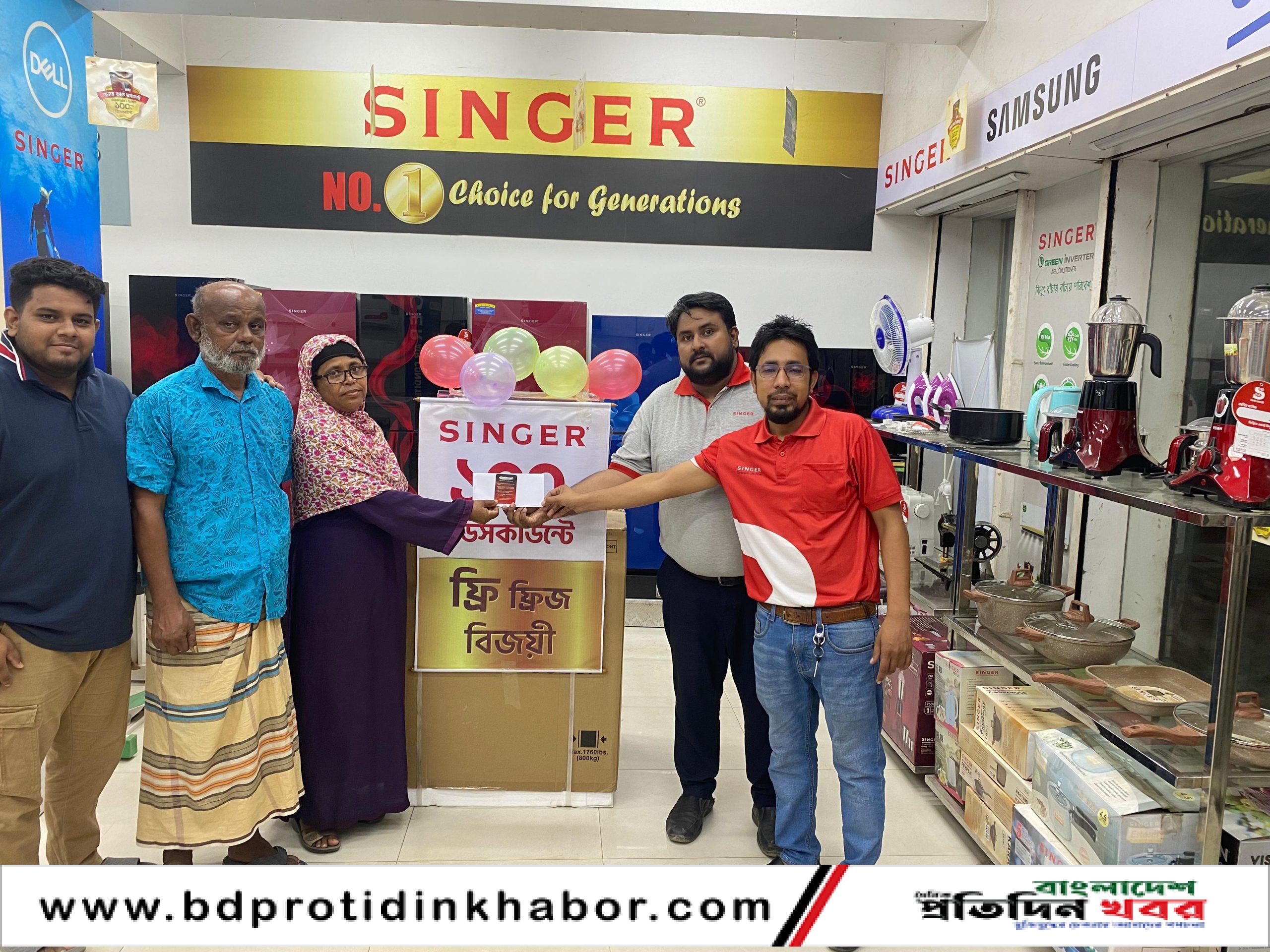 ফ্রি ফ্রিজ গ্রাহককে তুলে দেন ডিস্ট্রিক্ট ম্যানেজার মো: রুহুল কুদ্দুস ও ধনবাড়ী সিঙ্গার প্লাস শো-রুম ব্রাঞ্চ ম্যানেজার মোঃ আসাদ মিয়া । এসময় আরও উপস্থিত ছিলেন ধনবাড়ী সিঙ্গার প্লাস শো-রুম এর অন্যান্য কর্মচারীগণ।