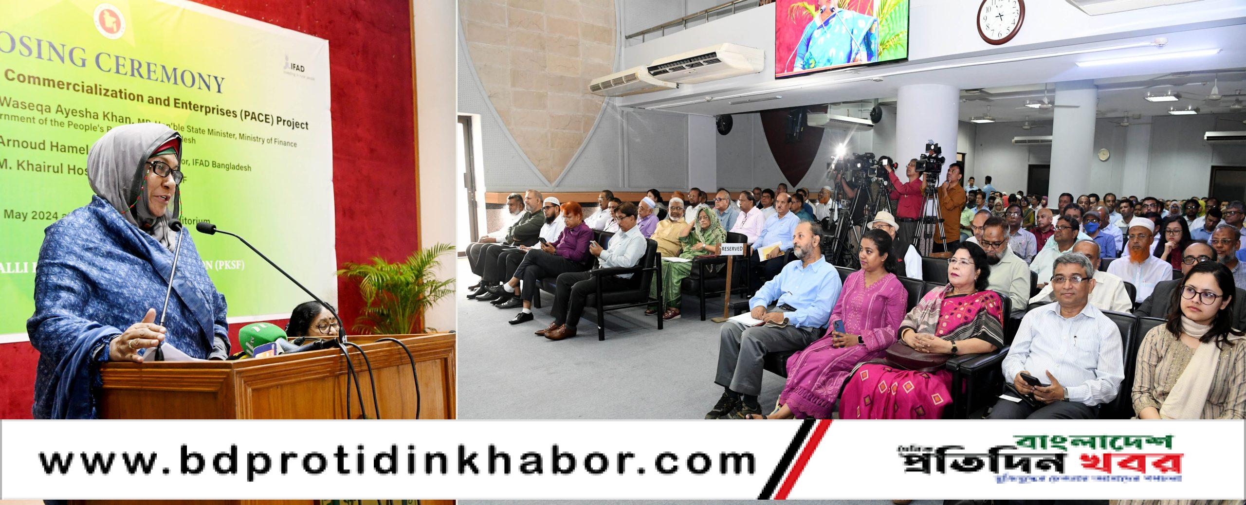 অর্থ প্রতিমন্ত্রী ওয়াসিকা আয়শা খান এমপি আজ ঢাকায় পিকেএসএফ মিলনায়তনে পিকেএসএফ আয়োজিত প্রমোটিং এগ্রিকালচারাল কমার্শিয়ালাইজেশন অ্যান্ড এন্টারপ্রাইজেস (পেইস) প্রকল্পের সমাপনী অনুষ্ঠানে প্রধান অতিথির বক্তৃতায় এসব কথা বলেন।