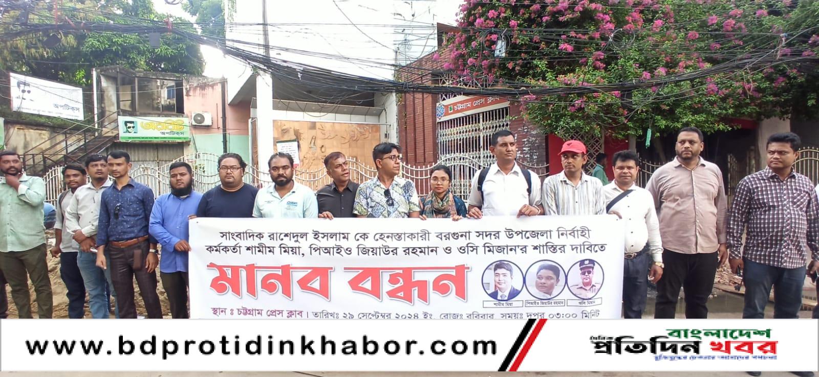 সাংবাদিক রাশেদুল ইসলাম কে হেনস্তাকারী বরগুনা সদর উপজেলা নির্বাহী কর্মকর্তা শামীম মিয়া, পিআইও জিয়াউর রহমান ও ওসি মিজান'র শাস্তির দাবিতে মানববন্ধন অনুষ্ঠিত হয়েছে।