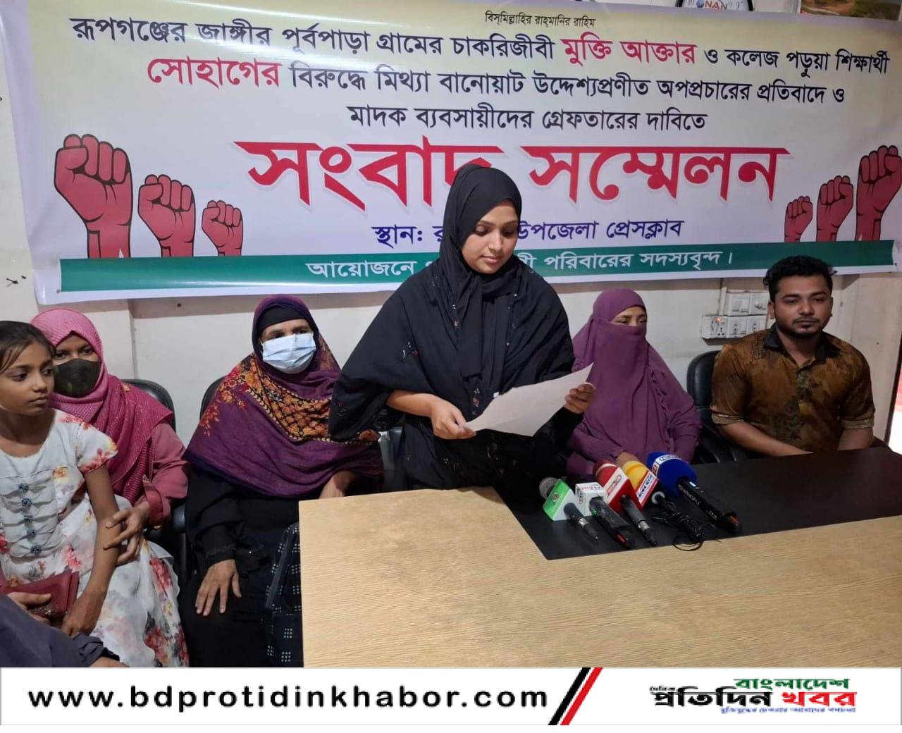নারায়ণগঞ্জের রূপগঞ্জ উপজেলার জাঙ্গীর পূর্বপাড়া এলাকার চাকরিজীবি মুক্তি আক্তার ও তার ভাই কলেজ শিক্ষার্থী সোহাগের বিরুদ্ধে মিথ্যা বানোয়াট উদ্দেশ্যপ্রণোদিত অপপ্রচারের প্রতিবাদে এবং মাদক ব্যবসায়ীদের গ্রেফতারের দাবিতে সংবাদ সম্মেলন করা হয়েছে।