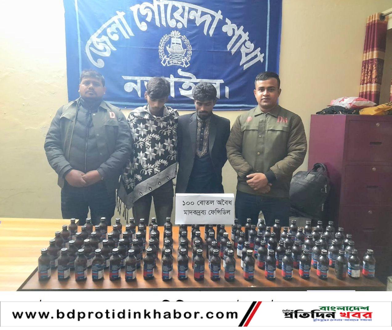 পরে এ অভিযানে গোচর ভূমি অফিসের প্রধান গেটের সামনের সড়ক থেকে সন্ধেহজনক ভাবে শাহাবুদ্দিন ইসলাম ও আলমিরাজ নামে দুই যুবককে আটক করে পুলিশ। এসময় তল্লাশি করে তাদের কাছ থেকে ১০০ বোতল ফেনসিডিল উদ্ধার করে পুলিশ।