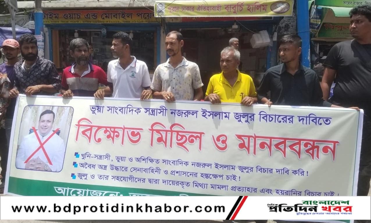 রাজশাহীতে কথিত ভুয়া সাংবাদিক, সন্ত্রাসী ও রাজশাহী প্রেসক্লাবের দখলদার সভাপতি নজরুল ইসলাম জুলুর বিচারের দাবিতে বিক্ষোভ মিছিল ও মানববন্ধন অনুষ্ঠিত হয়েছে। সোমবার (৭ জুলাই ২০২৫) সকাল ১১টা ৩০ মিনিট থেকে দুপুর ১২টা পর্যন্ত রাজশাহী মহানগরীর সাহেববাজার জিরো পয়েন্টে টিকাপাড়া খুলিপাড়া এলাকার ভুক্তভোগী এলাকাবাসীর ব্যানারে এ কর্মসূচি পালিত হয়।