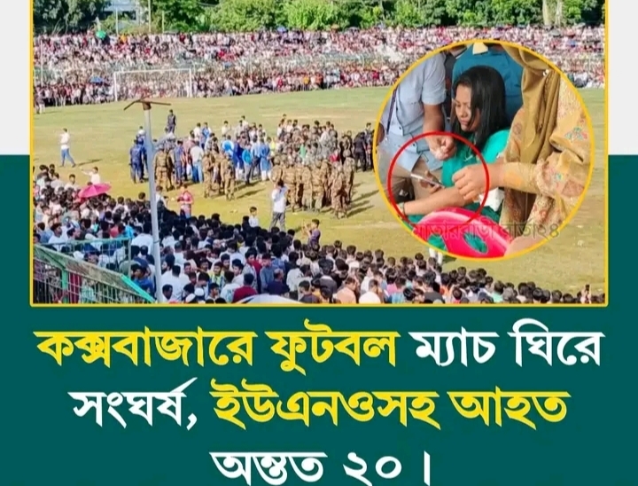 কক্সবাজারে জেলা প্রশাসক গোল্ডকাপ ফুটবল টুর্নামেন্টের ফাইনাল ম্যাচের আগে দর্শকদের সঙ্গে আইনশৃঙ্খলা বাহিনীর সংঘর্ষ ও ভাঙচুরের ঘটনা ঘটেছে। এতে সদরের ইউএনও নিলুফা ইয়াসমিনসহ প্রায় ২০ জন আহত হয়েছেন। শুক্রবার (১২ সেপ্টেম্বর) বিকালে কক্সবাজার বীরশ্রেষ্ঠ রুহুল আমিন স্টেডিয়ামে এ ঘটনা ঘটে। কক্সবাজারে ফুটবল টুর্নামেন্টের ফাইনাল ম্যাচের দিন সংঘর্ষ ও ভাঙচুর করা হয়। জানা যায়, রামু ও টেকনাফ উপজেলার মধ্যে ফাইনাল ম্যাচ হওয়ার কথা ছিল। ম্যাচের আগেই স্টেডিয়াম দর্শকে কানায় কানায় পরিপূর্ণ হয়ে যায়। এ সময় অনেক দর্শক গেট ভেঙে ভেতরে প্রবেশ করেন। সেনাবাহিনী, পুলিশ ও র্যাবের সদস্যরা তাদের বের করতে গেলে উত্তেজনা সৃষ্টি হয়।একপর্যায়ে গ্যালারি ও আইনশৃঙ্খলা বাহিনীকে লক্ষ্য করে ইট-পাটকেল ছোঁড়া হয়। এতে সদরের ইউএনওসহ প্রায় ২০ জন আহত হন। পরে পরিস্থিতি নিয়ন্ত্রণে আনে আইনশৃঙ্খলা বাহিনী।