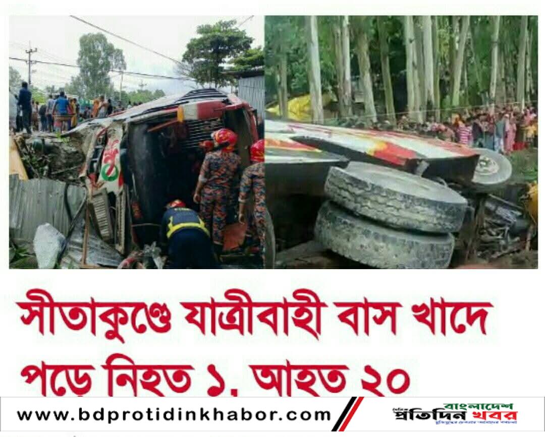 চট্টগ্রামের সীতাকুণ্ডে একটি যাত্রীবাহী বাস খাদে পড়ে মোহাম্মদ আলী (৩০) নামে এক যুবক নিহত হয়েছেন। সোমবার (১৫ সেপ্টেম্বর) দুপুর ১২টার দিকে ঢাকা-চট্টগ্রাম মহাসড়কের কুমিরা এলাকায় এ ঘটনা ঘটে।স্থানীয় ও প্রত্যক্ষদর্শী সূত্রে জানা গেছে, সোমবার দুপুর ১২টার দিকে চট্টগ্রাম থেকে ঢাকা যাওয়ার সময় আইরিন পরিবহন নামে একটি বাস কুমিরা ইলিয়াস পেট্টোল পাম্প এলাকায় নিয়ন্ত্রণ হারিয়ে সড়কের পাশের খাদে পড়ে যায়। এসময় সড়কের পাশের একটি ভলকানাইজিং দোকানের মালিকও বাসে চাপা পড়ে কাদায় নিমজ্জিত হন। এ ঘটনায় বাসে থাকা অন্তত ১০ যাত্রী কমবেশি আহত হলেও তাদের অবস্থা আশঙ্কামুক্ত হওয়ায় তারা নিজ নিজ গন্তব্যে চলে যান।খবর পেয়ে কুমিরা ফায়ার সার্ভিস ও সিভিল ডিফেন্স ও বারআউলিয়া হাইওয়ে পুলিশ ঘটনাস্থলে গিয়ে রেকার দিয়ে বাসটি খাদ থেকে তুললে মাটিতে গেঁথে থাকা ভলকানাইজিং শপের মালিক মোহাম্মদ আলীকে উদ্ধার করা হলেও তিনি মারা যান। ফায়ার সার্ভিসের উদ্ধারকর্মীরা বলেন, বাস উল্টে গিয়ে রাস্তার পাশের এক দোকানিকে ধাক্কা দেয়। এতে তার শরীরের মাথা থেকে অর্ধেক অংশ কাদায় চাপা পড়ে। তবে তার পা ছিল বাইরে। ঘটনার পর হাইওয়ে পুলিশের রেকার দিয়ে বাস তুলে সে লোকটিকে উদ্ধার করার অল্প সময়ের মধ্যে তিনি মারা গেছেন।কুমিরা ফায়ার সার্ভিসের স্টেশন অফিসার মো. আব্দুল্লাহ আল মামুন বলেন, এ ঘটনায় একজন মানুষ মারা গেছে। আর আহতরা তেমন গুরুতর নন। তারা নিজ নিজ গন্তব্যে ফিরে গেছেন।
