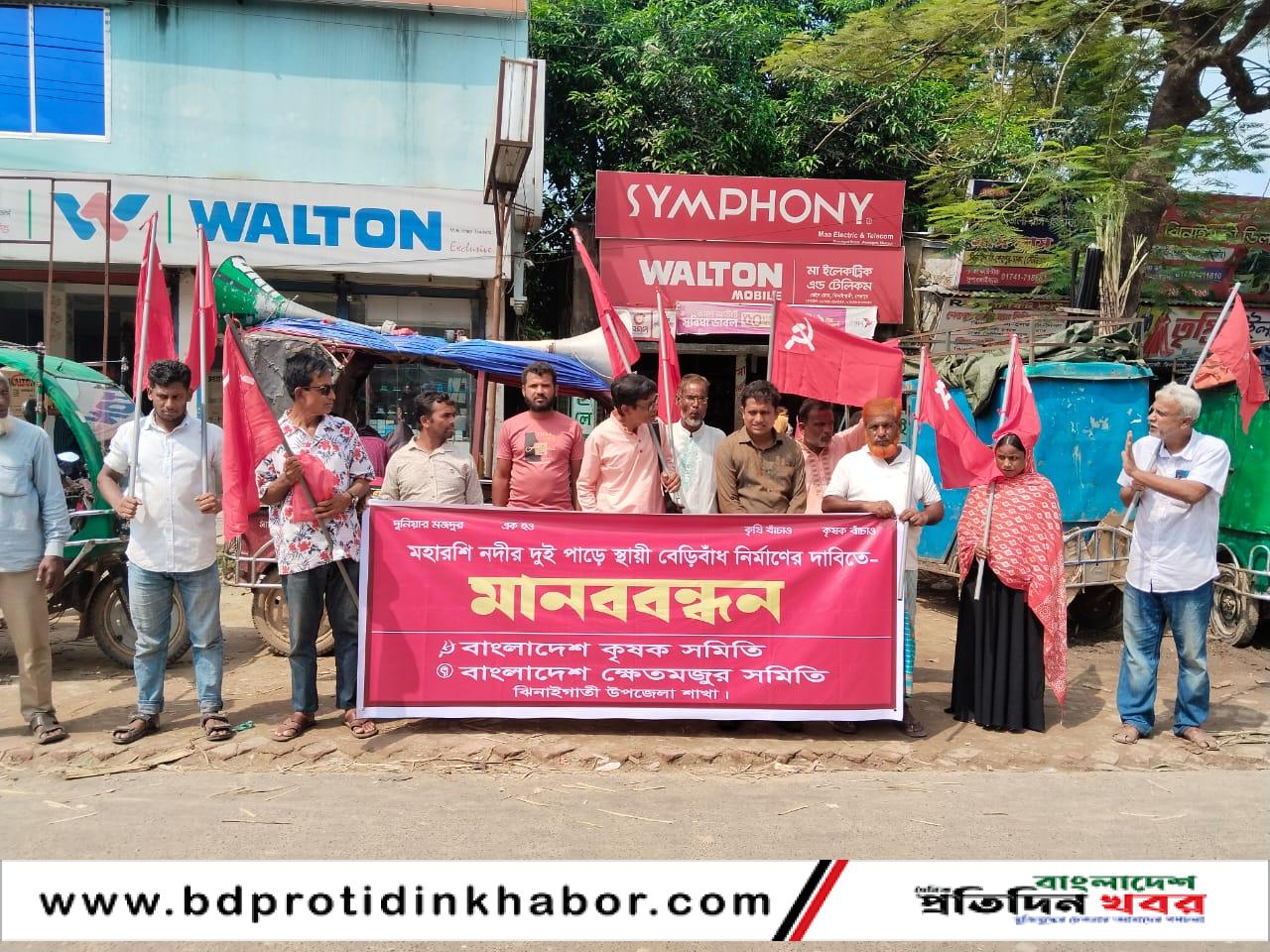 শেরপুরের ঝিনাইগাতীতে মহারশি নদীর দুই পাড়ে স্থায়ী বেড়িবাঁধ নির্মাণের দাবিতে মানববন্ধন করেছে বাংলাদেশ কৃষক সমিতি ও বাংলাদেশ ক্ষেতমজুর সমিতি উপজেলা শাখা। মঙ্গলবার (৭ অক্টোবর) দুপুরে উপজেলার সদর বাজারের প্রধান সড়কে ঘণ্টাব্যাপী এ মানববন্ধন অনুষ্ঠিত হয়।