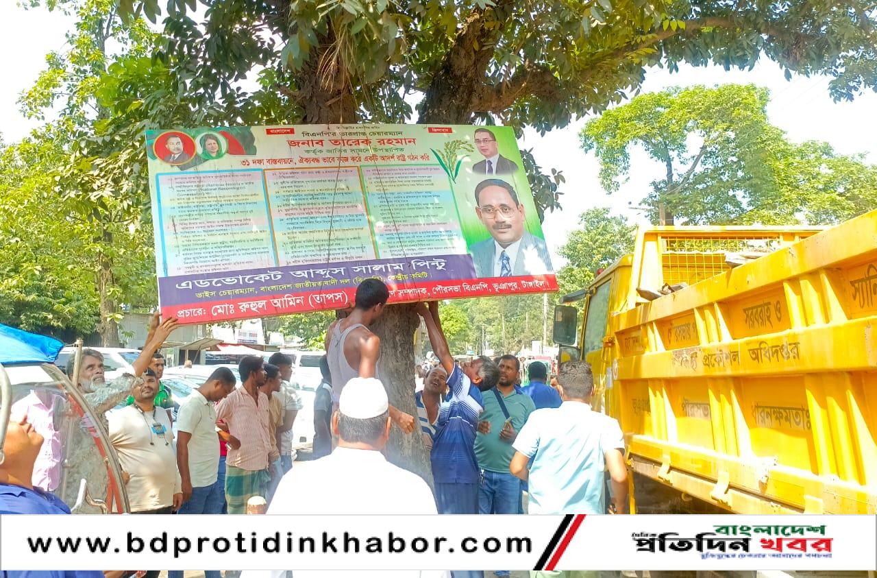 টাঙ্গাইল: টাঙ্গাইলের ভূঞাপুরে পৌর শহরের বিভিন্ন এলাকায় অবৈধভাবে স্থাপিত ব্যানার, ফেস্টুন ও পোস্টার অপসারণে উচ্ছেদ অভিযান পরিচালনা করেছে পৌর প্রশাসক।