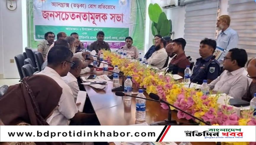 নওগাঁয় অ্যানথ্রাক্স(তড়কা) রোগ প্রতিরোধে এক জনসচেনতামূলক সভা অনুষ্ঠিত হয়েছে। বৃহস্পতিবার সদর উপজেলা পরিষদ সভা কক্ষে সদর উপজেলা প্রশাসন ও উপজেলা প্রাণিসম্পদ দপ্তরের আয়োজনে এই সভা অনুষ্ঠিত হয়।