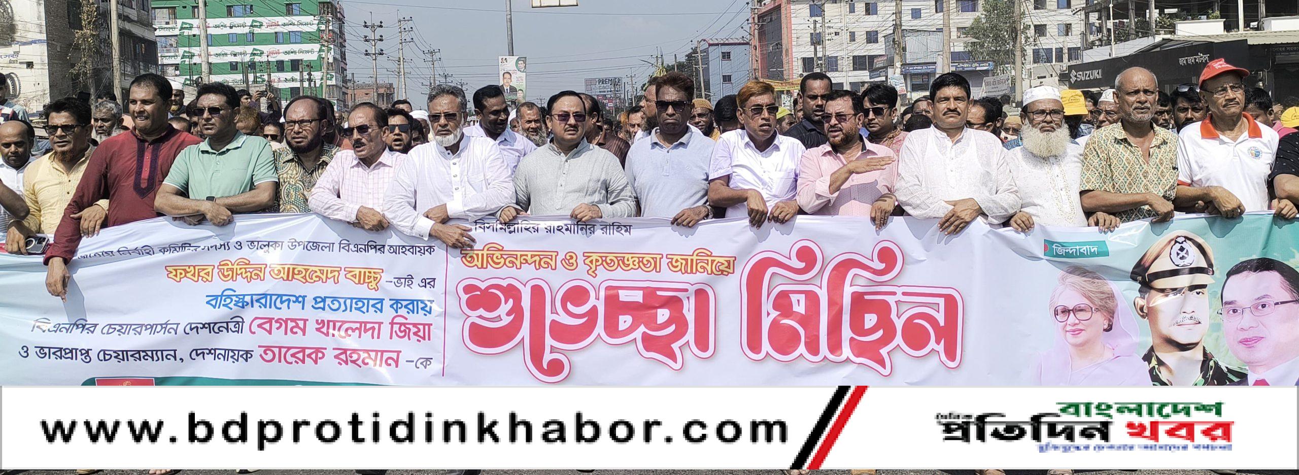 দলের চেয়ারপার্সন দেশনেত্রী বেগম খালেদা জিয়া ও ভারপ্রাপ্ত চেয়ারম্যান দেশনায়ক তারেক রহমান তার বিরুদ্ধে দেওয়া বহিষ্কারাদেশ প্রত্যাহার করায় কৃতজ্ঞতা ও শুভেচ্ছা জানিয়ে এক শুভেচ্ছা মিছিল করেছে বাচ্চু সমর্থিত ভালুকা উপজেলা বিএনপি, পৌর বিএনপি এবং অঙ্গ ও সহযোগী সংগঠনের নেতাকর্মীরা।