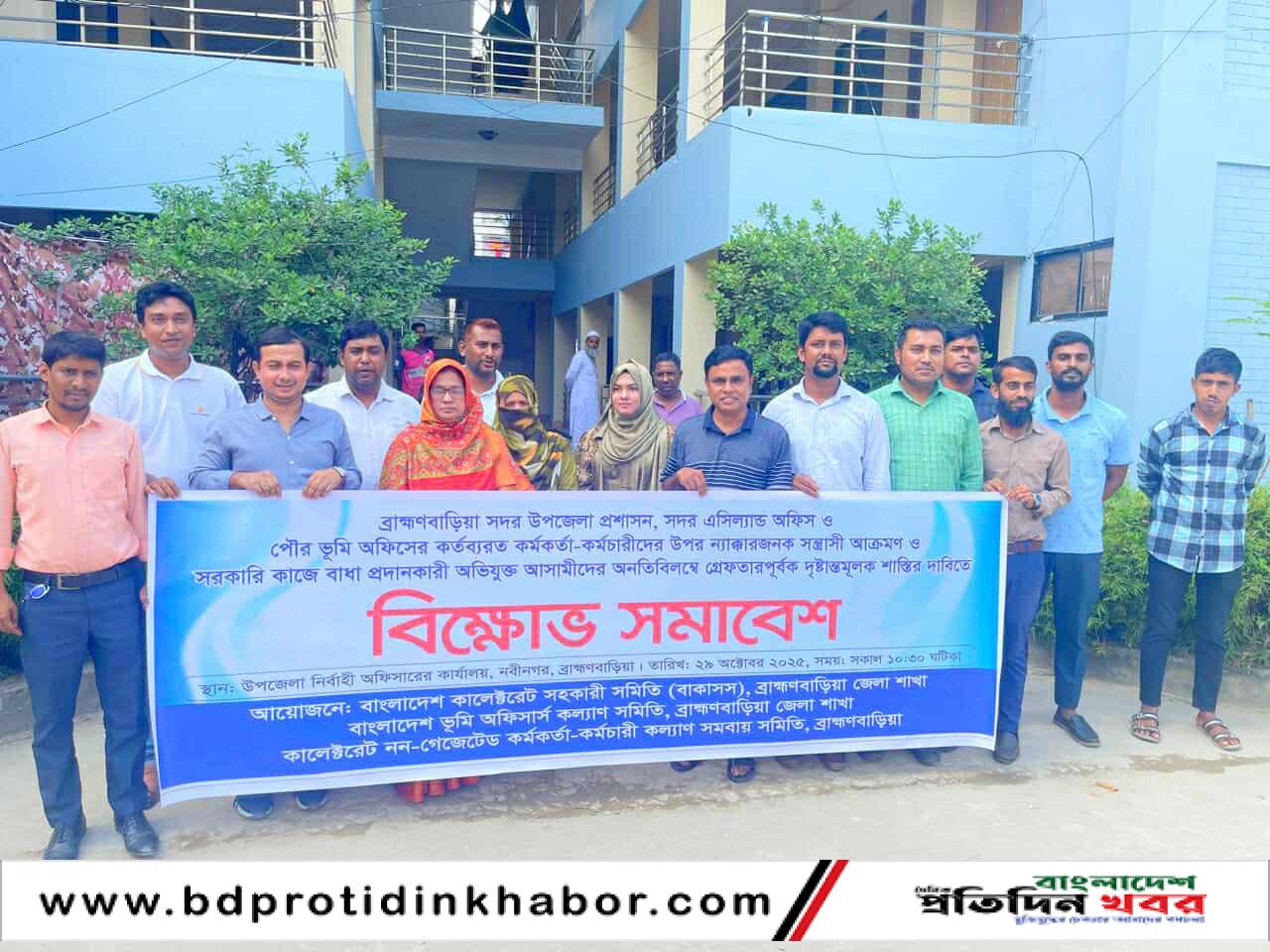 ব্রাহ্মণবাড়িয়ার নবীনগরে কর্তব্যরত সরকারি কর্মকর্তা-কর্মচারীদের উপর ন্যাক্কারজনক সন্ত্রাসী হামলা ও সরকারি কাজে বাধা প্রদানের ঘটনায় জড়িত আসামীদের দ্রুত গ্রেপ্তার ও দৃষ্টান্তমূলক শাস্তির দাবিতে বিক্ষোভ সমাবেশ অনুষ্ঠিত হয়েছে।