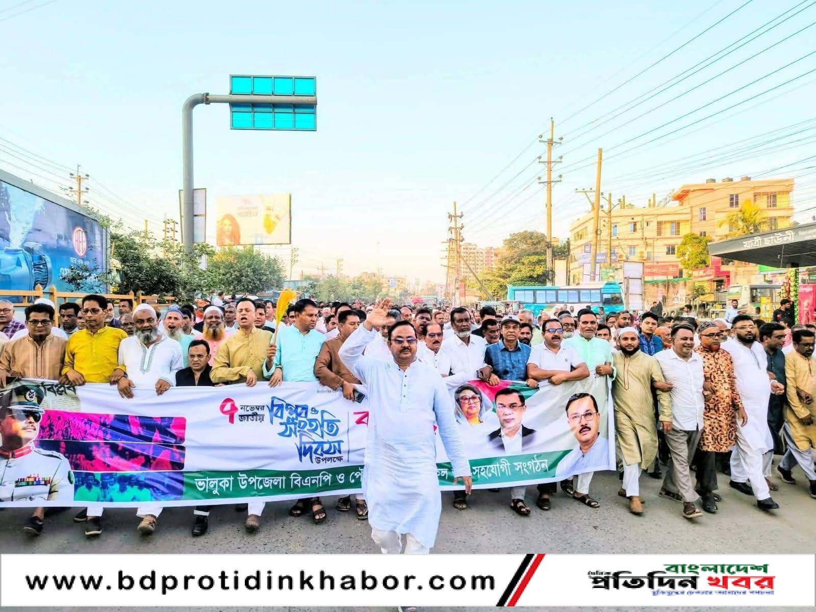 ঐতিহাসিক ৭ নভেম্বর জাতীয় বিপ্লব ও সংহতি দিবস উপলক্ষে ভালুকা উপজেলা ও পৌর বিএনপির উদ্যোগে বর্ণাঢ্য র্যালি ও আলোচনা সভা অনুষ্ঠিত হয়েছে। এতে নেতৃত্ব দেন ময়মনসিংহ-১১ (ভালুকা) আসনের বিএনপির মনোনীত প্রার্থী, বিএনপির জাতীয় নির্বাহী কমিটির সাবেক সদস্য ও ভালুকা উপজেলা বিএনপির সাবেক সভাপতি ফখর উদ্দিন আহমেদ বাচ্চু।