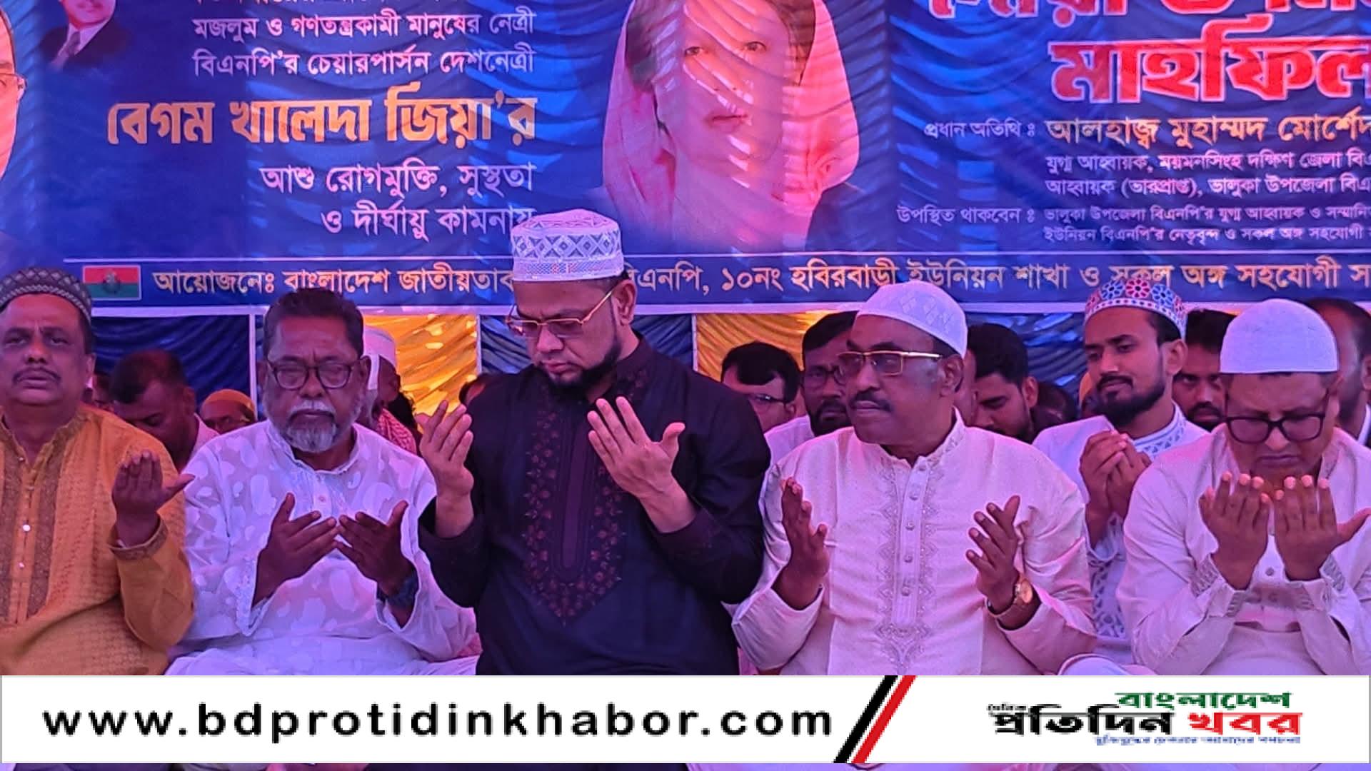 ময়মনসিংহের ভালুকায় সাবেক তিনবারের প্রধানমন্ত্রী ও বিএনপির চেয়ারপার্সন দেশনেত্রী বেগম খালেদা জিয়ার আশু রোগমুক্তি, সুস্থতা ও দীর্ঘায়ু কামনায় দোয়া মাহফিল অনুষ্ঠিত হয়েছে।