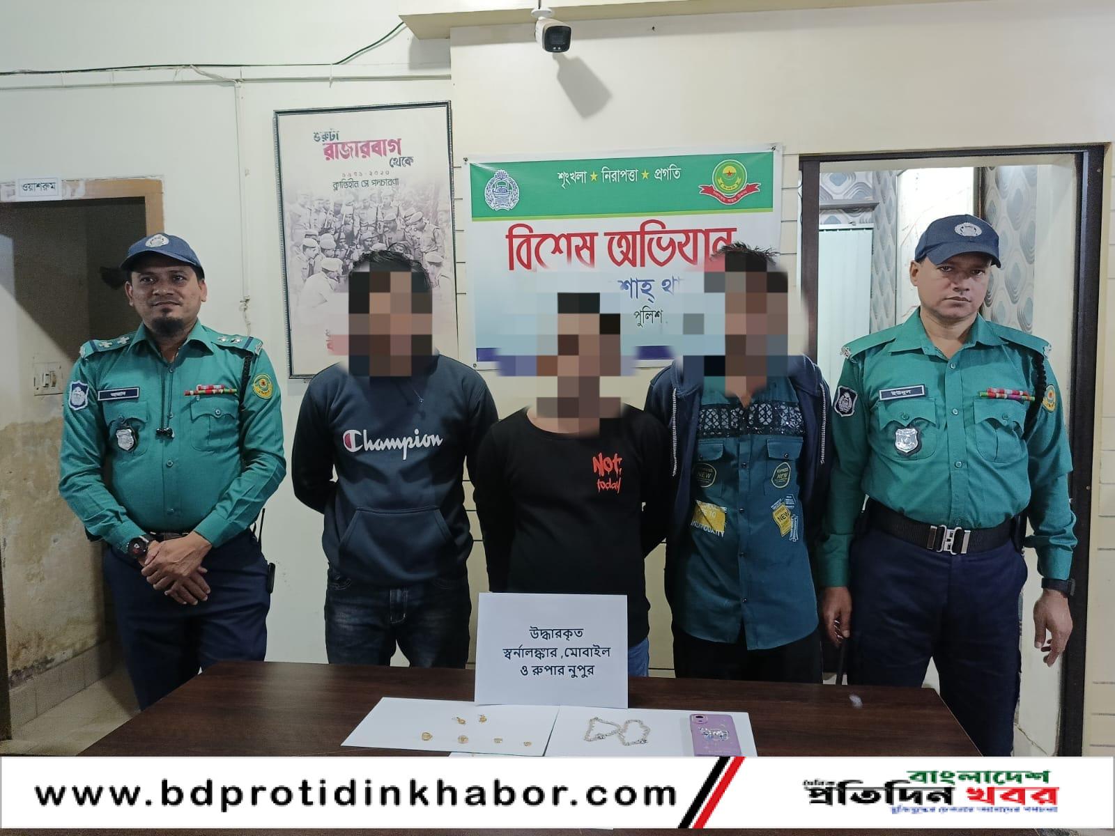চট্টগ্রাম মেট্রোপলিটন পুলিশের (সিএমপি) আকবরশাহ থানা এলাকায় স্বর্ণালঙ্কার ও মূল্যবান সামগ্রী চুরির ঘটনায় মামলা রুজুর ১২ ঘণ্টার কম সময়ে তিন চোরকে গ্রেফতার করেছে পুলিশ। একই সঙ্গে উদ্ধার করা হয়েছে প্রায় তিন ভরি স্বর্ণালঙ্কার, একটি মোবাইল ফোন ও রুপার নুপুর।