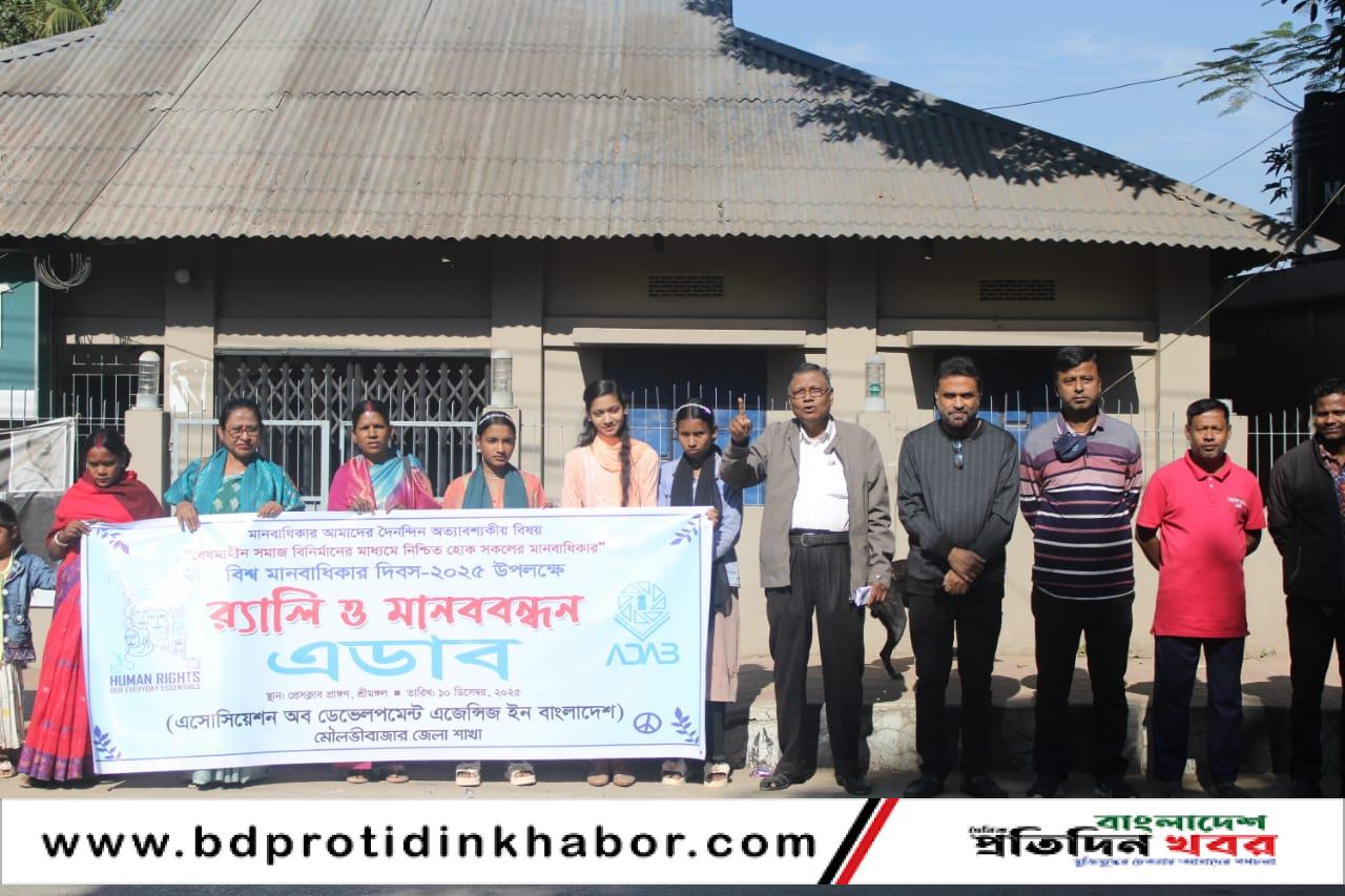 বুধবার (১০ ডিসেম্বর) সকাল ১০টায় শ্রীমঙ্গল প্রেসক্লাবের সামনে এডাব মৌলভীবাজার জেলা কমিটির উদ্যোগে, র্যালি মানববন্ধনে সভাপতিত্ব করেন এডাব মৌলভীবাজার জেলা সভাপতি এস এ হামিদ, সাধারণ সম্পাদক পরিতোষ দেব, সদস্য মিজানুর রহমান আলাম, সদস্য মোহন চন্দ্র দেব এবং মৌলভীবাজার চা জনগোষ্ঠী আদিবাসী ফ্রন্টের প্রধান নির্বাহী পরিমল সিং বাড়াইক প্রমুখ।