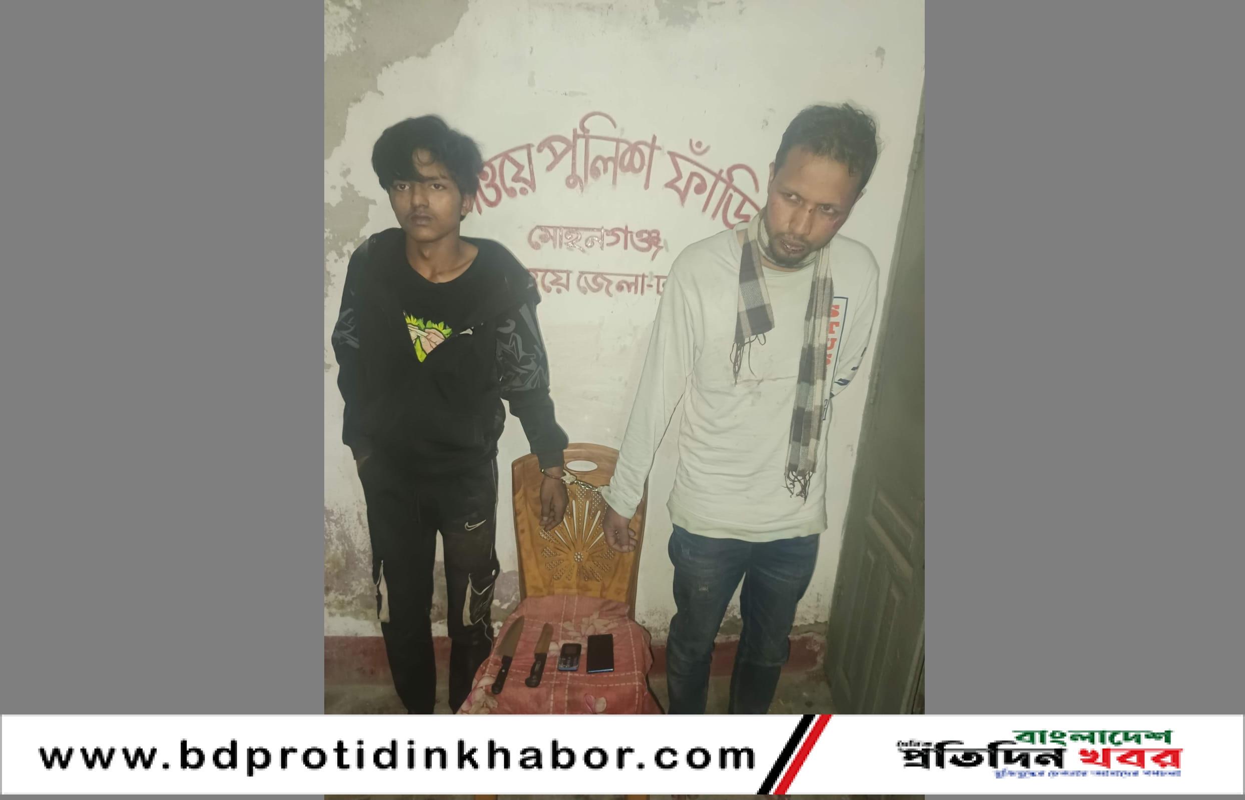 পরে তাদের মোহনগঞ্জ রেলওয়ে পুলিশ ফাঁড়িতে তাদের সোপর্দ করা হয়। বৃহস্পতিবার বিকালে নেত্রকোনা জেলার মোহনগঞ্জ রেলওয়ে পুলিশ ফাঁড়ির ইনচার্জ এসআই মোবারক হোসেন এ তথ্য নিশ্চিত করেছেন। আটকরা হলেন, ময়মনসিংহ শহরের কেওয়াটখালী এলাকার আজমাইন হোসেন নিঝুম (৩০) ও মো. মেহেদী হাসান তানভীর (১৮)।