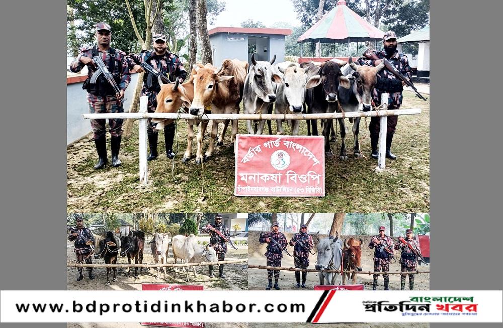 চাঁপাইনবাবগঞ্জ ব্যাটালিয়ন (৫৩ বিজিবি) গোপন তথ্যের ভিত্তিতে গতকাল ১০ জানুয়ারি ভোর ০৫টা হতে ০৯টা প্রায় ৪ ঘন্টা পর্যন্ত ৫৩ বিজিবি এর বিশেষ টহলদল পৃথক পৃথক ০৪টি অভিযান পরিচালনা করে ১৬টি গরু জব্দ করে। অভিযানসমূহে ৫৩ বিজিবির অধীনস্থ মনাকষা বিওপি শিবগঞ্জ থানাধীন মনাকষা ইউনিয়েনের মনোহরপুর গ্রাম হতে ০৬টি ও ফকিরপাড়া গ্রাম হতে ০৪টি, মাসুদপুর বিওপি শিবগঞ্জ থানাধীন মনাকষা ইউনিয়নের চৌধুরী স্মরণী গ্রাম হতে ০৪টি এবং ওয়াহেদপুর বিওপি শিবগঞ্জ থানাধীন সূর্যনারায়নপুর ইউনিয়নের তেররশিয়া গ্রাম হতে ০২টি গরু জব্দ করা হয়।