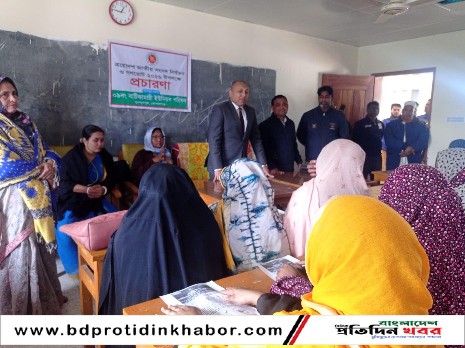 গোপালগঞ্জের মুকসুদপুরে আসন্ন ত্রয়োদশ জাতীয় সংসদ নির্বাচন ও গণভোট - ২০২৬ উপলক্ষে দুস্থ মহিলা খাদ্য সহায়তার উপকারভোগীদের নিয়ে গণভোট সম্পর্কে জনসচেতনতা সৃষ্টি করতে প্রচারণা করা হয়েছে।