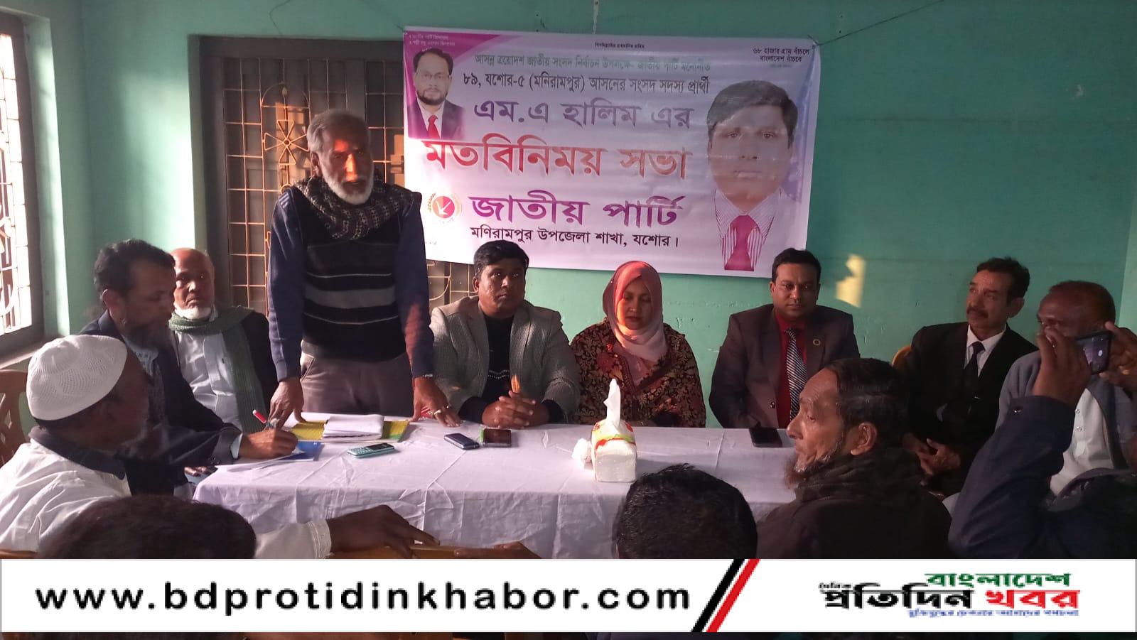 বুধবার ১৪ জানুয়ারি মণিরামপুর উপজেলা জাতীয় পার্টির কার্যালয়ে এ মতবিনিময় সভা অনুষ্ঠিত হয়। সভায় প্রধান অতিথি হিসেবে উপস্থিত ছিলেন জাতীয় পার্টির কেন্দ্রীয় কমিটির ভাইস চেয়ারম্যান শরীফুল ইসলাম (সরু চৌধুরী)।