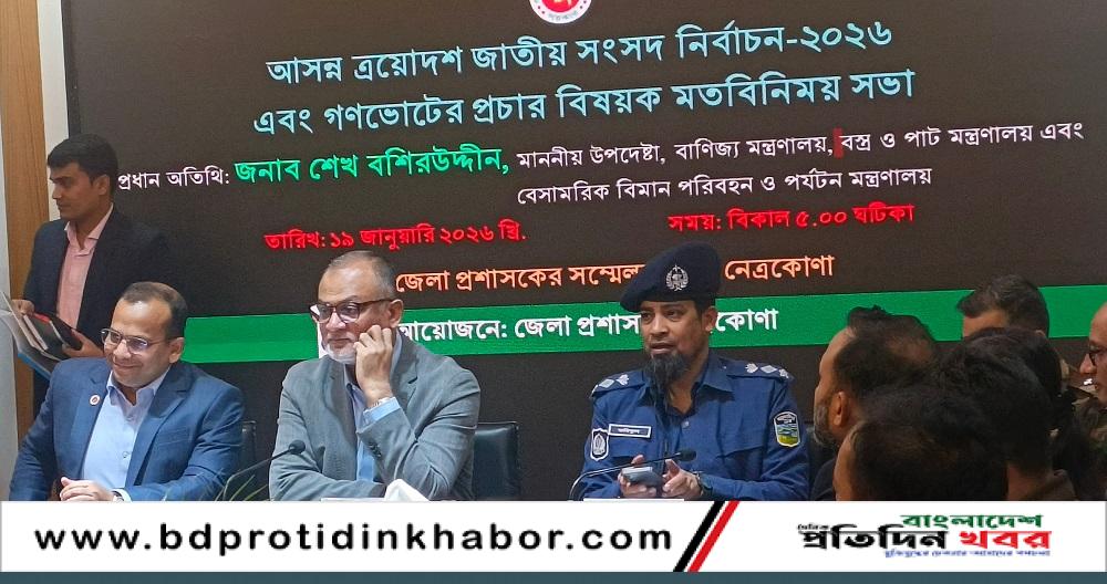 ত্রয়োদশ জাতীয় সংসদ নির্বাচন ও গণভোট সম্পর্কিত মতবিনিময় সভা ১৯ জানুয়ারি নেত্রকোণা জেলা প্রশাসকের সম্মেলন কক্ষে অনুষ্ঠিত হয়েছে।