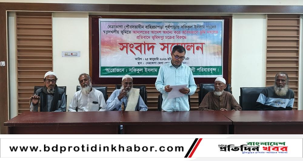 নেত্রকোনা পৌরসভার বহিরাচাপড়া এলাকায় পৈতৃক সূত্রে পাওয়া মালিকানাধীন জমি জবরদখল ও আদালতের নিষেধাজ্ঞা অমান্য করার প্রতিবাদে সংবাদ সম্মেলন করেছেন ভুক্তভোগী পরিবার। রবিবার (২৫ জানুয়ারি) বিকেলে নেত্রকোনা জেলা প্রেসক্লাব মিলনায়তনে এই সংবাদ সম্মেলন অনুষ্ঠিত হয়।