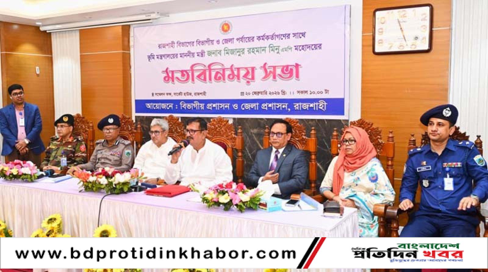 রাজশাহী বিভাগের বিভাগীয় ও জেলা পর্যায়ের কর্মকর্তাদের সঙ্গে মতবিনিময় সভায় প্রশাসনকে সততা, দক্ষতা ও সাংবিধানিক দায়িত্ববোধ নিয়ে কাজ করার নির্দেশ দিয়েছেন ভূমি মন্ত্রণালয়ের মন্ত্রী মিজানুর রহমান মিনু এমপি। শুক্রবার (২০ ফেব্রুয়ারি) সকালে রাজশাহী সার্কিট হাউজের সম্মেলন কক্ষে বিভাগীয় প্রশাসন ও জেলা প্রশাসনের আয়োজনে এ সভা অনুষ্ঠিত হয়। সভায় প্রধান অতিথির বক্তব্যে ভূমিমন্ত্রী মিজানুর রহমান মিনু বলেন,“আমি রাজশাহীর মাটির সন্তান। আমরা একে অপরের সহকর্মী, কেউ কারও বস নই। আপনারা সাংবিধানিক দায়িত্বপ্রাপ্ত—সেই দায়িত্ব যথাযথভাবে পালন করতে হবে।”