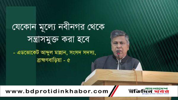 ব্রাহ্মণবাড়িয়া-৫ (নবীনগর) আসনের মাননীয় সংসদ সদস্য অ্যাডভোকেট আব্দুল মান্নান বলেছেন, “আজকে নবীনগর পশ্চিম ইউনিয়নে অবৈধ বালু উত্তোলনকে কেন্দ্র করে যে হামলার ঘটনা ঘটেছে, তার পরপরই আমি পুলিশ প্রশাসনকে বালু সন্ত্রাসীদের বিরুদ্ধে কঠোর আইনগত ব্যবস্থা নিতে নির্দেশ দিয়েছি। এবার বালু সন্ত্রাসীদের কঠোর হাতে দমন করা হবে।”